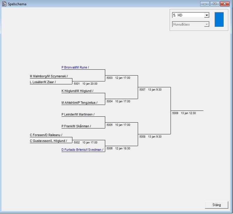 KM 2018 Àr nu fÀrdiglottat och redo för spel! Kika pÄ alla spelscheman nedan! Alla matcher spelas bÀst av 3 set med ett supertiebreak (tiebreak till 10 poÀng) som avgörande set vid 1-1. Tiderna pÄ schemat gÄr efter "follow by" stilen dÀr man drar igÄng sin match nÀr matchen före Àr klar. SÄ försök vara i hallen minst 20 minuter innan match start ifall tidigare match skulle vara klar spelad. Resultat fÄr ni gÀrna skriva upp pÄ schemat vid anslagstavlan nere vid omklÀdningsrummen samt rapportera till Richard, Jasmin eller Paulina som borde vara pÄ plats.
