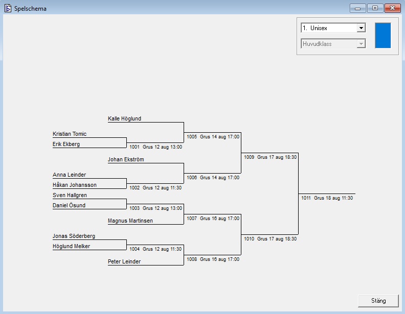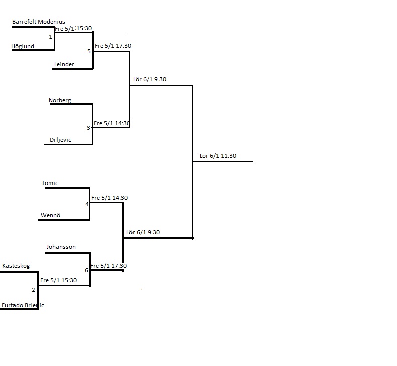 De som var anmÀlda till Unisex B klassen flyttades till Unisex. De andra klasserna blev inte av pga för fÄ anmÀlningar tyvÀrr. Lottningen med tider och datum hittar ni nedan! Lycka till alla deltagande!